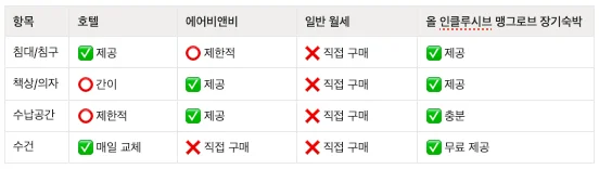 침구류(10-20만원), 수건(3-5만원), 조리도구와 식기(10-20만원)를 별도로 구입할 필요가 없습니다. 올인클루시브는 이 모든 것이 제공되어 초기 생활용품 구입 비용만 30-50만원을 절약할 수 있습니다.