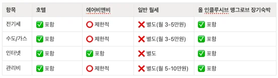 에어비앤비: 숙소마다 정책이 다릅니다. 일부는 전기세를 월 일정 금액까지만 포함하고 초과분을 청구하기도 합니다. 여름 에어컨이나 겨울 난방을 눈치 보며 사용하게 되는 경우가 많습니다.