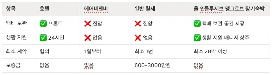 호텔 장기 투숙: 객실 내 주방이 없어서 모든 식사를 외식이나 배달로 해결해야 합니다. 매일 청소 서비스는 장점이지만, 업무용 공간이나 미팅룸은 없는 경우가 많습니다.