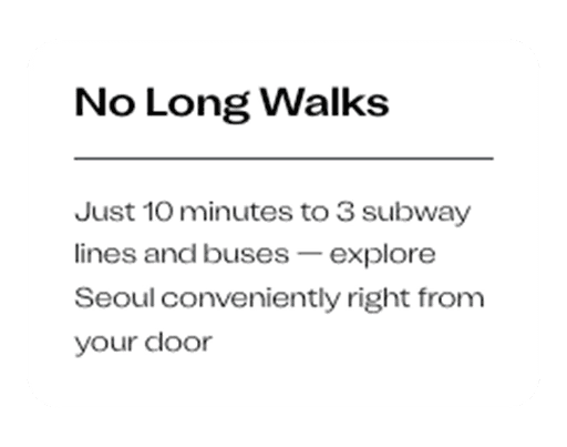 Just 10 minutes to 3 subway lines and bus stops - get to Gangnam, Hongdae, or your locations without transfers or delays.