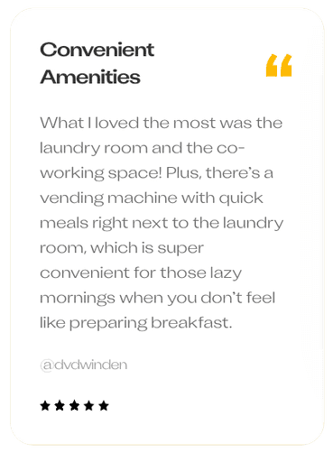 What I loved the most was the laundry room and the co-working Space! Plus, there's a vending machine with quick meals right next to the laundry room, which is super convenient for those lazy mornings when you don't feel like preparing breakfast.