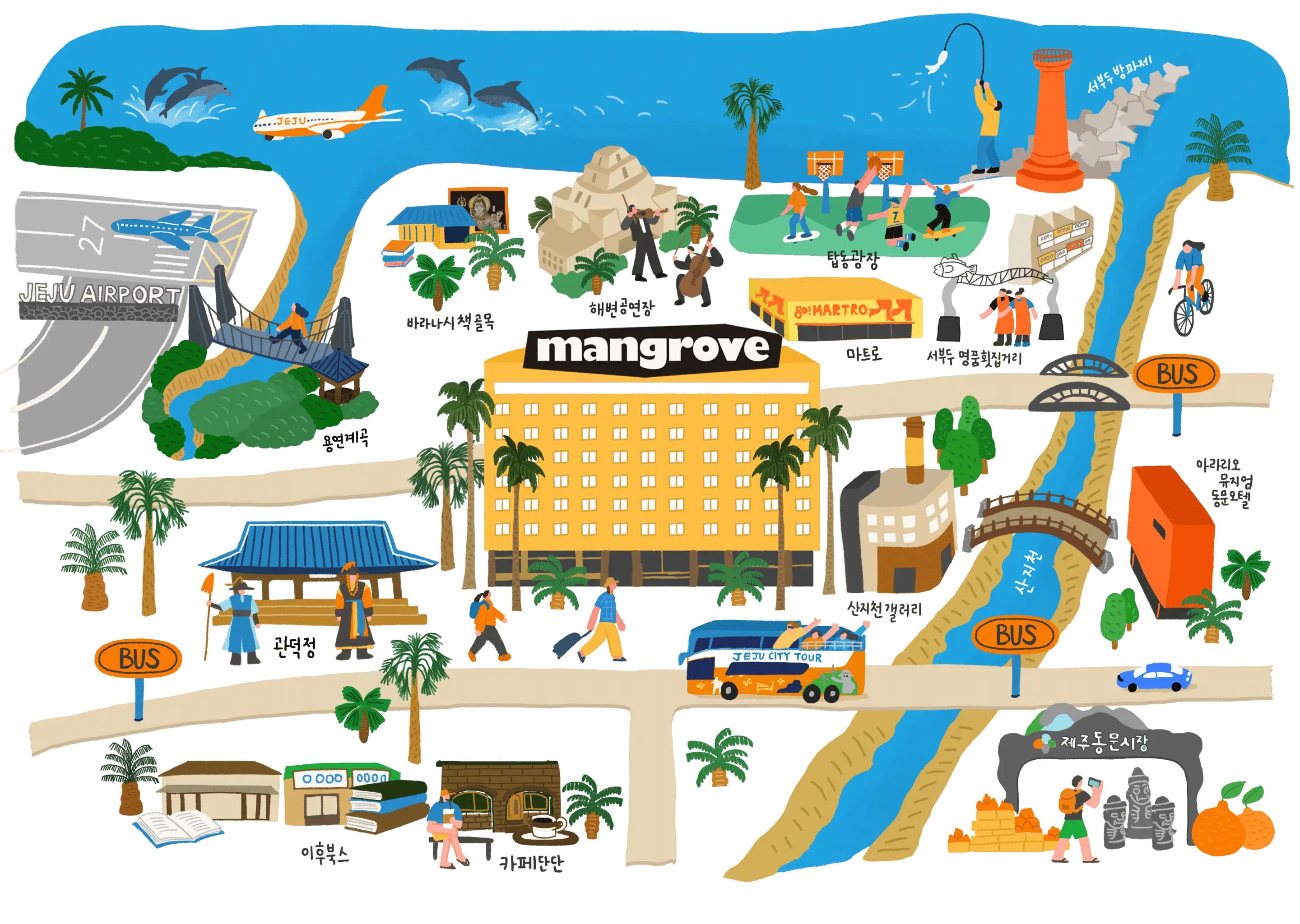 Tapdong in Jeju is an old town located 15 minutes drive from the airport. There are many interesting spots including Dongmun Market with local specialities and goods, along with easy access to restaurants and marts, and other daily necessities. This neighborhood also offers beautiful views with natural walking paths near Sanji Stream and Yongyeon Valley.
