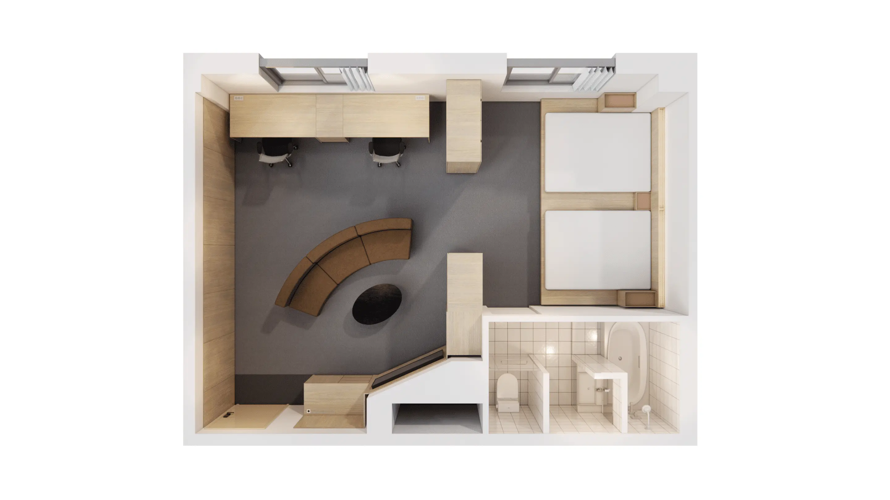 Cooking is not possible, as our rooms aren’t equipped with kitchens. Please use the Canteen on the 7th floor, which has an induction cooktop, oven, refrigerator, cutlery, cooking utensils, and basic condiments. Note that bringing foods with strong smells into the rooms is not allowed, except for dormitories.